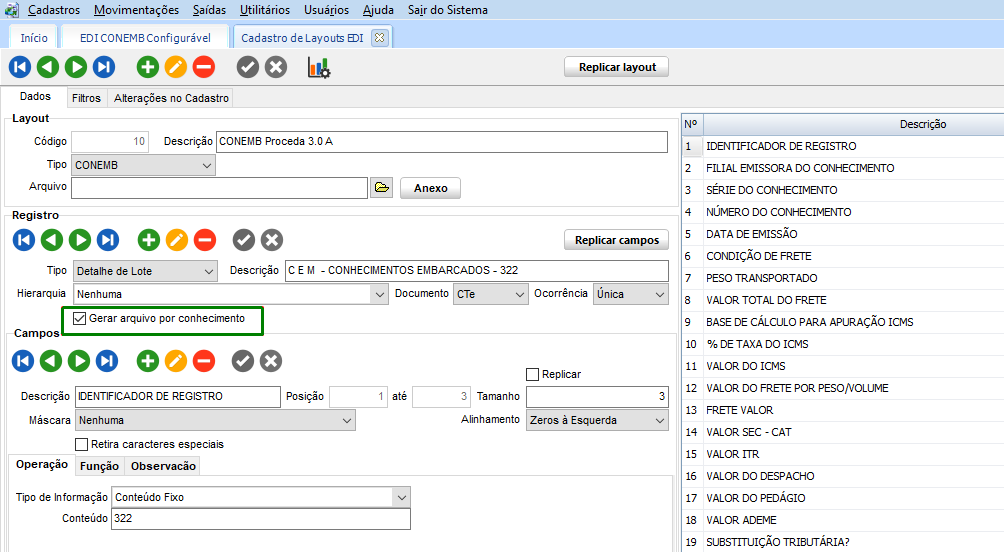 Em Utilitários > EDI CONEMB Configurável, ao realizar a exportação de um arquivo que tenha a configuração acima marcada, o sistema apresentará os dados das notas vinculadas ao CTe com quebra de linhas quando o valor mais alto for ultrapassado.