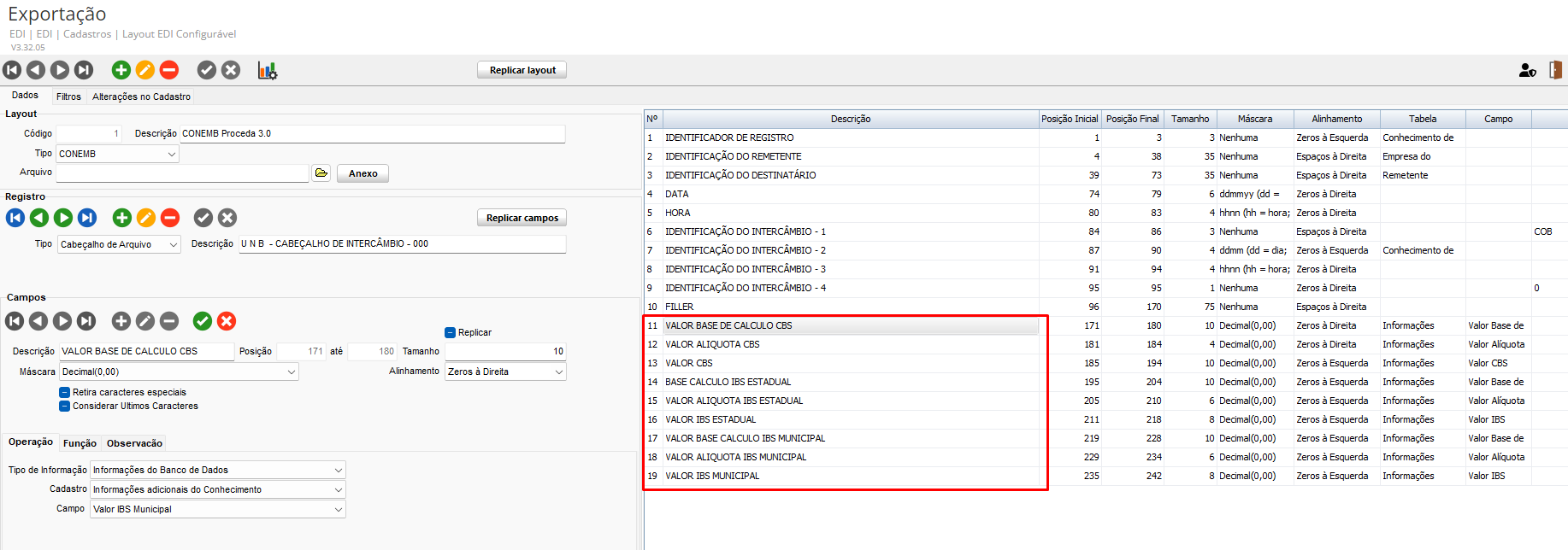 Em Cadastros > Layout EDI Configurável > Exportação, é necessário que os seguintes campos estejam configurados: