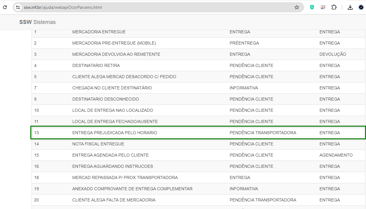 Se a mensagem no log for apresentada como descrição da ocorrência não informada, isso ocorre devido à ausência do código da lista do SW no campo Histórico Remetente, do cadastro de Vinculação de histórico de entrega. Para mais detalhes, consulte a lista de códigos em SSW WebAPI Recepção Ocorrências de Parceiro.