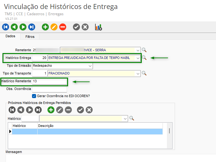No módulo CCE, acesse Cadastros > Entregas > Vinculação de Histórico de Entregas. É essencial cadastrar o valor do código da entrega do SSW no campo Histórico Remetente, conforme o que já está registrado no sistema: