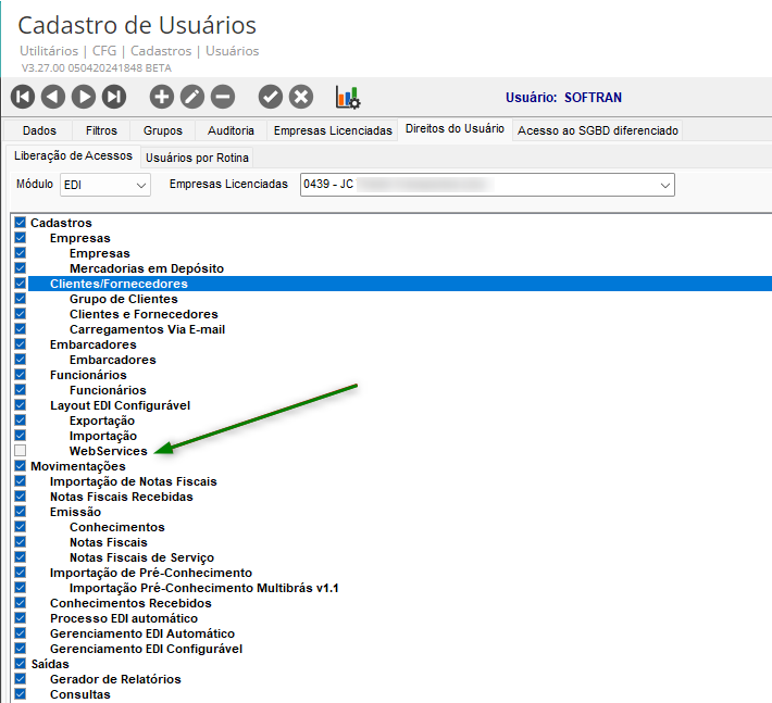 - Na guia Direitos do Usuário, localize e marque a opção Webservices dentro do grupo de Cadastro de Layout EDI Configurável: