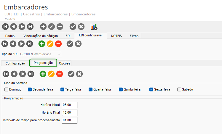 - Na guia Programação, configure os dias da semana e horários do processamento do serviço: