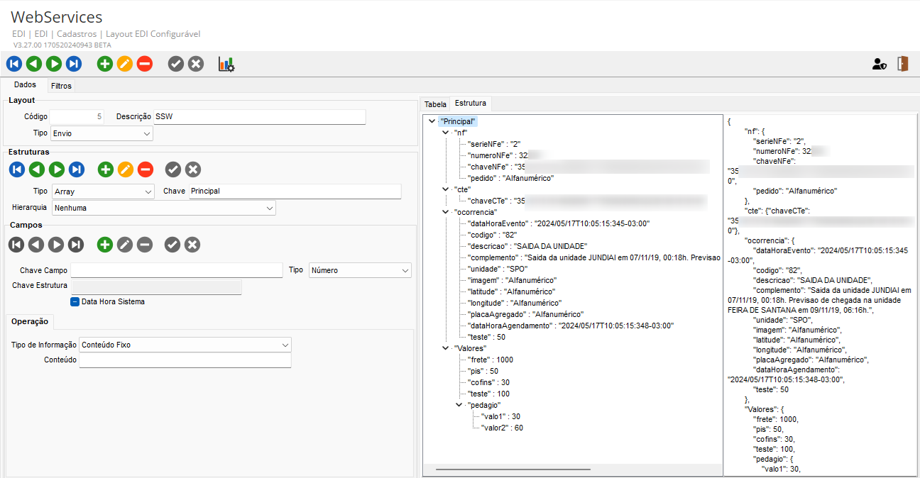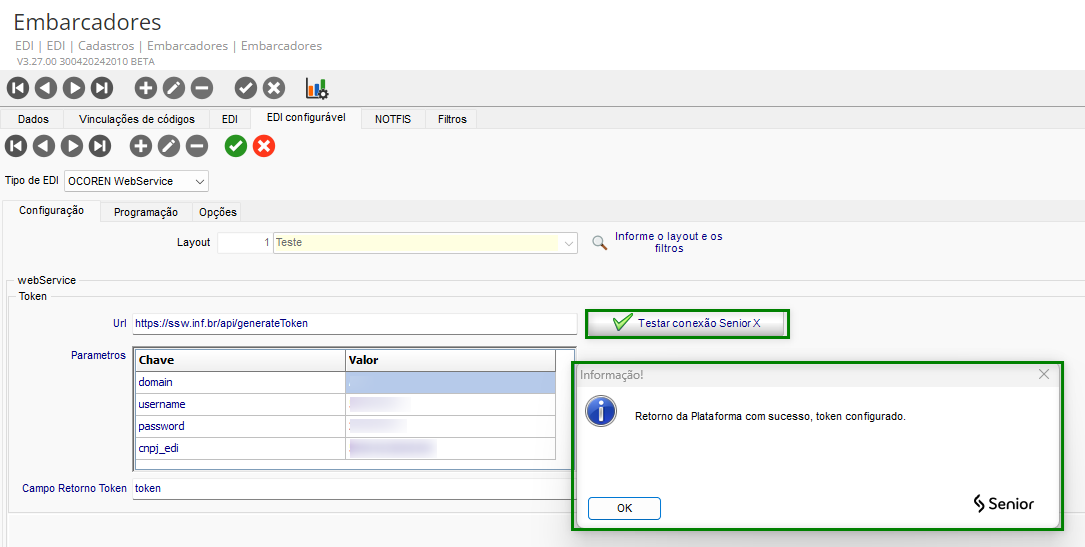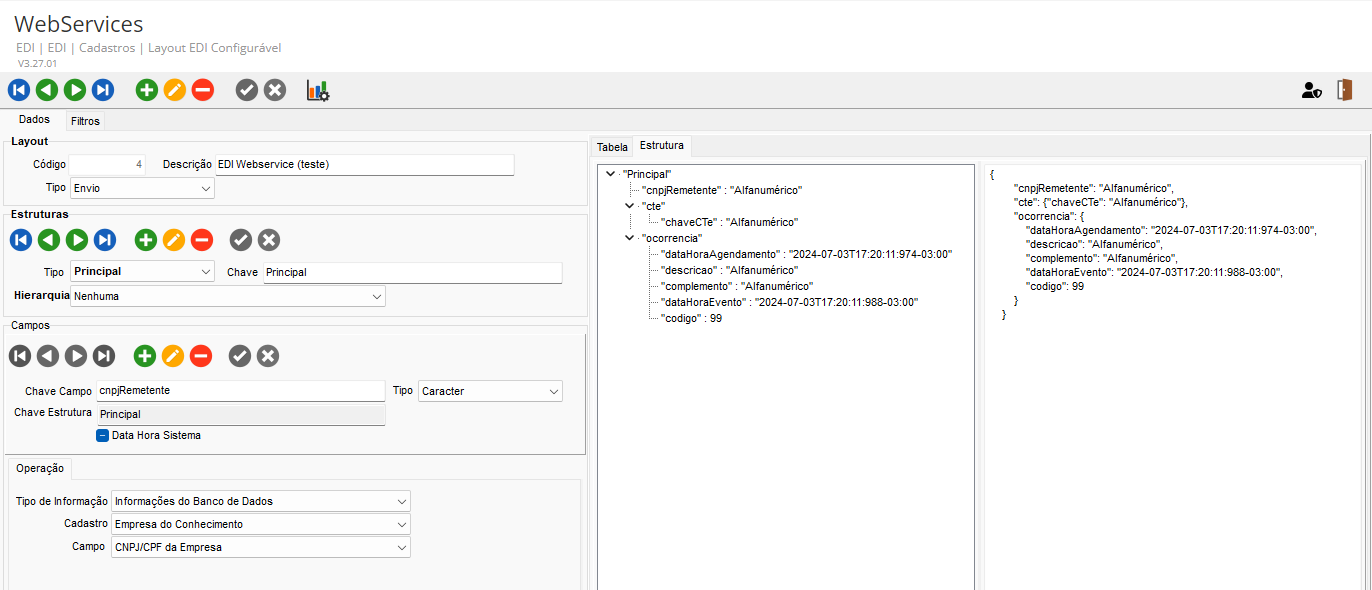 Foi criado um novo cadastro de layout EDI configurável para Webservices. Na tela de cadastro de embarcadores, na guia EDI Configurável, foi adicionado um novo tipo de EDI denominado Ocoren Webservice. Essa tela permite configurar os parâmetros de conexão com o Webservice e o layout previamente configurado.