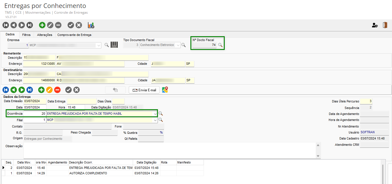 A seguir, cadastre um movimento de entrega para este CT-e, de acordo com o movimento de entrega configurado: