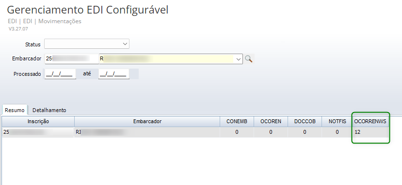 No módulo EDI, acesse Movimentações > Gerenciamento EDI Configurável. A tela existente no sistema foi adaptada para incluir a coluna OCORENWS, que apresenta as informações do embarcador integrado pelo Webservice (WS):