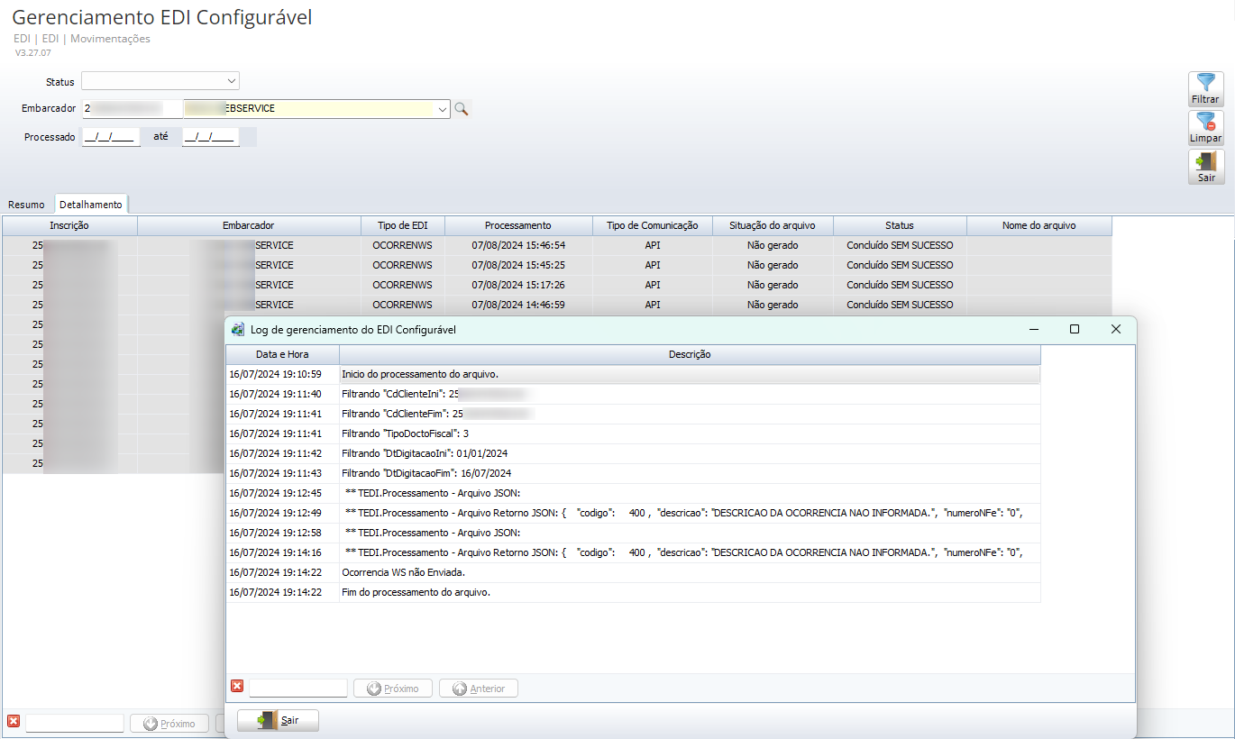 Na guia Detalhamento, o log de processamento é exibido. Para visualizar os dados completos, efetue um duplo clique na linha desejada: