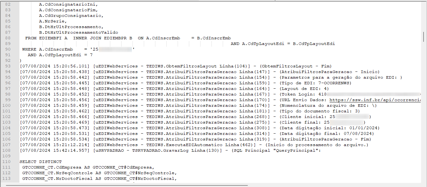 Após iniciar, no log do processamento, será apresentado os dados que foram gerados e se a conexão com SSW está correta: