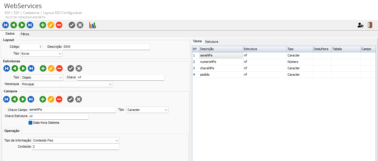 No módulo EDI, acesse Cadastros > Layout EDI Configurável > Webservices. Foi incluída uma nova tela para o cadastro de layout de arquivos, seguindo o mesmo padrão dos cadastros de EDI já existentes no sistema.