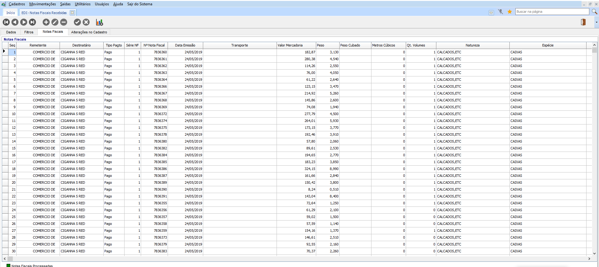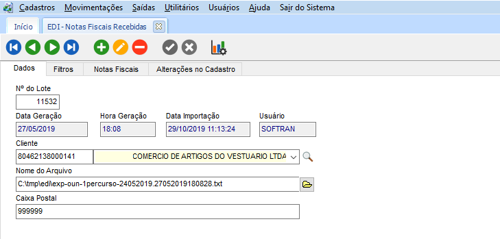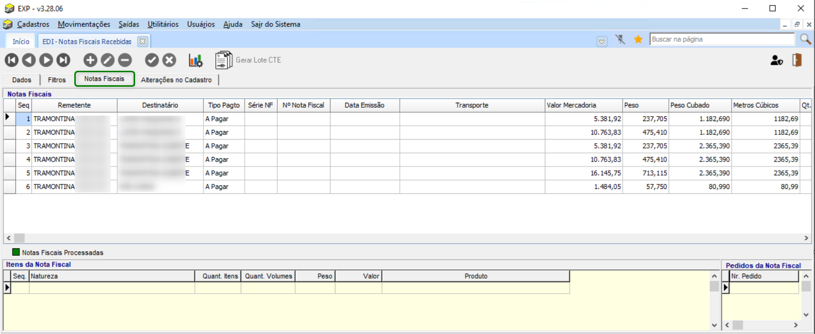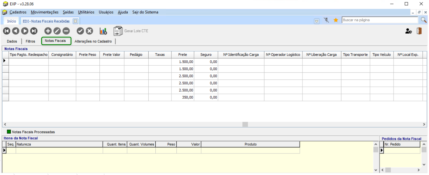 Para Consultar o Lote, vá até Expedição > Movimentações > EDI > Notas Fiscais Recebidas. Na guia Notas Fiscais, serão exibidas todas as notas fiscais importadas: