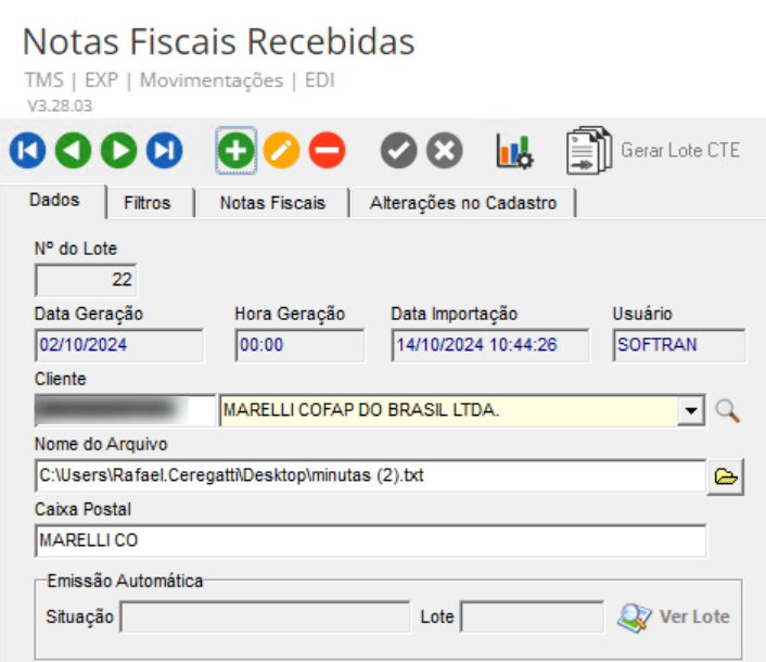 Implementamos a tela de importação NOTFIS para o cliente Marelli, permitindo ao usuário selecionar o arquivo de importação, adicionar observações e configurar o uso da placa do veículo nas notas fiscais. Além disso, é possível acompanhar os dados importados através da guia de log.