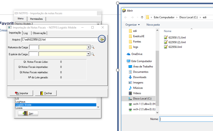 Para realizar a importação das Notas Fiscais via arquivo de importação padrão LogisticMobileDM, acesse o módulo EXP em Movimentações > EDI > Importação de Notas Fiscais > Logistic Mobile e selecione o arquivo de importação.