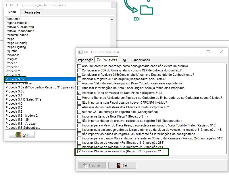 No módulo EDI, em Movimentações > Importação de Notas Fiscais, selecionar a opção Proceda 3.0a. Na tela NOTFIS – Proceda 3.0 A, guia Configurações, marcar a opção Importar Chave de Acesso NFe (Registro 313, posição 215).
