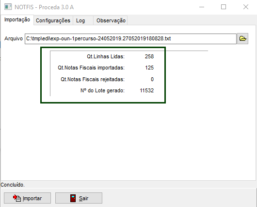 - Quantidade de Notas Fiscais Importadas