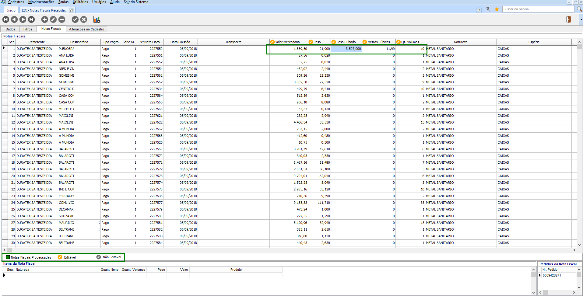 No módulo EDI em Movimentações > Notas Fiscais Recebidas, selecione um lote já importado. Na guia Notas Fiscais, apresenta as colunas que estão habilitadas de acordo com legenda apresentada em tela. Desta forma, é possível editar as colunas que estão marcadas em amarelo: