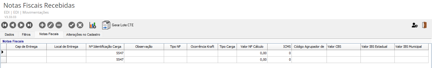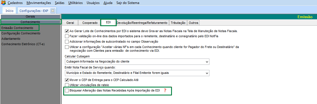 No módulo CFG em Utilitários > Configurações > TMS > EXP – Expedição > guia Conhecimento > guia Emissão Conhecimento > guia EDI, está a configuração Bloquear Alteração das Notas Recebidas Após Importação de EDI, onde se desmarcada irá habilitar todos os campos do grid para alteração, e se marcada, irá permitir alterar somente campos marcados na configuração citadas acima.