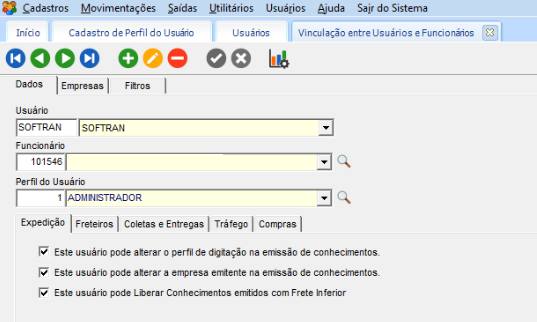 Com o usuário selecionado, para este exemplo utilizamos o SOFTRAN que está cadastrado com o tipo Supervisor (verifique em CFG em Cadastros > Usuários > Usuários) e