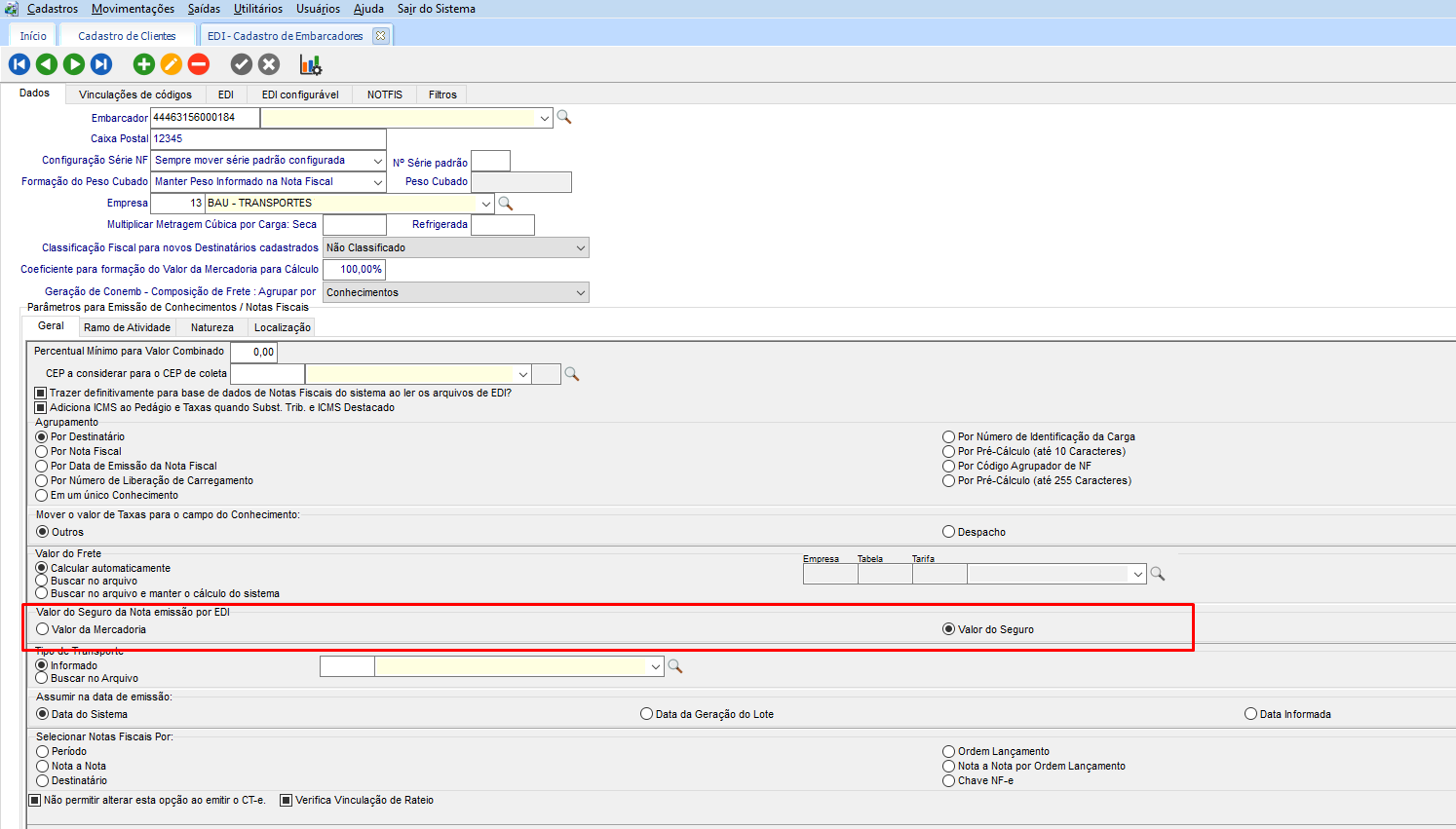 O sistema possui a configuração do Valor do Seguro e Valor da Mercadoria na emissão de conhecimento por EDI no Cadastro de Embarcadores. O campo Valor de Cálculo de NF, será utilizado com o Valor da Mercadoria, ou o Valor do Seguro, de acordo com a configuração marcada.