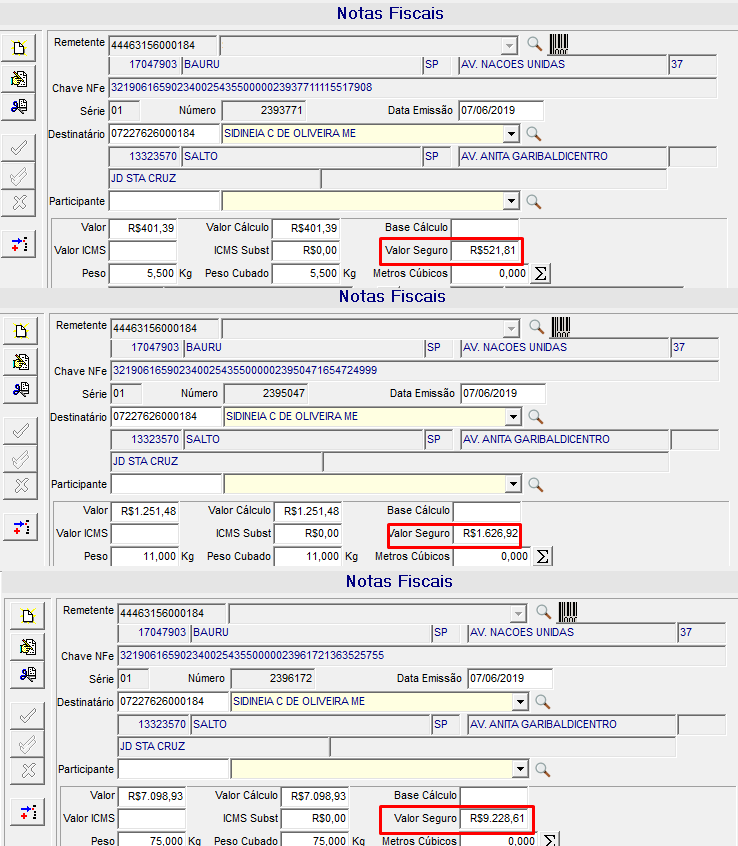 Terminado o processo, o campo valor do seguro ficará de acordo com o campo valor que é o valor total da mercadoria.