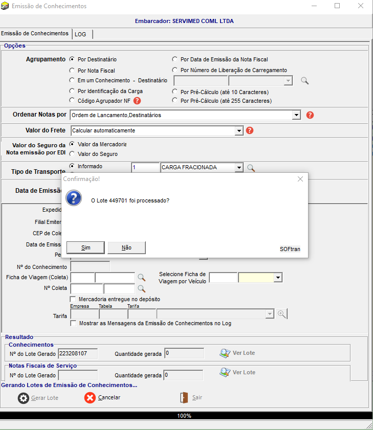 Na proxima tela, clique em Gerar Lote O sistema irá apresentar mensagem de confirmação clique em Sim: