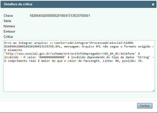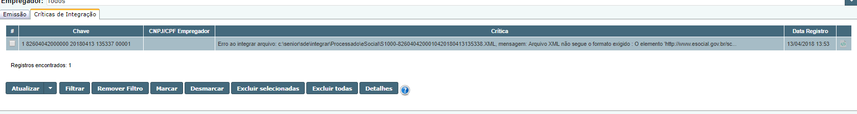 Ao selecionar o registro e clicar em Detalhes é possível ver qual o erro apresentado