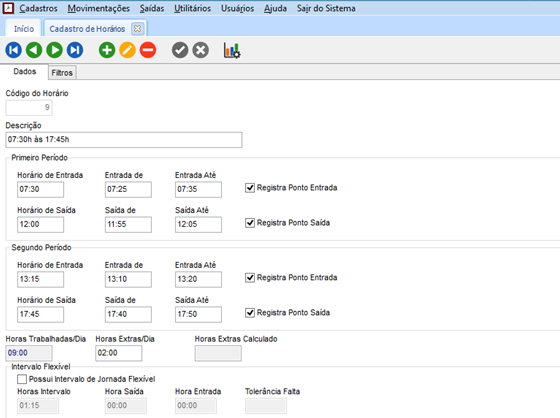 São as informações de identificação do horário contratual, apresentando o código e período de validade do registro. Detalha também, quando for o caso, os horários de início e término do intervalo para a jornada de trabalho.