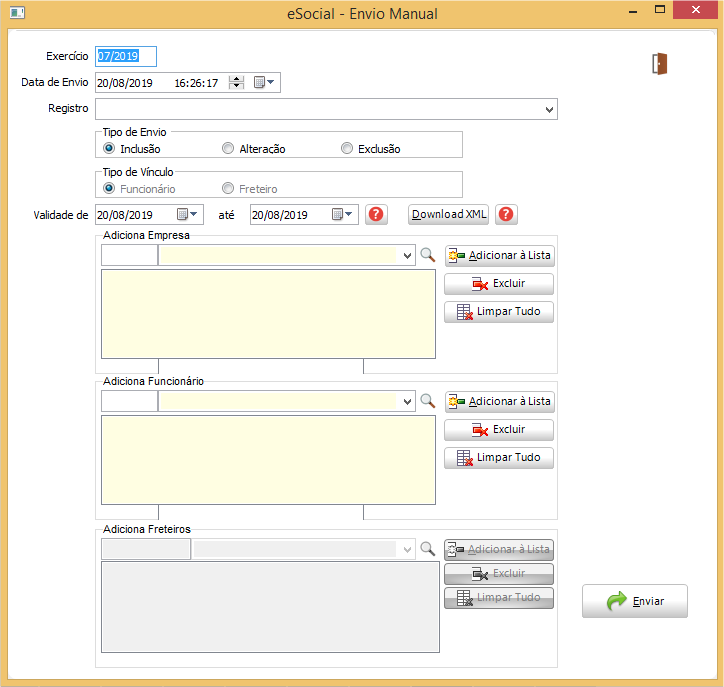 No módulo FPG, na rotina Movimentações > eSocial > Envio Manual é onde deve ser realizada a exportação do eSocial. Essa tela é utilizada para a geração de todos os arquivos, portanto os campos são necessários para alguns arquivos e desnecessários para outros, funciona como uma tela de filtros, segue uma breve explicação sobre a função de cada campo: