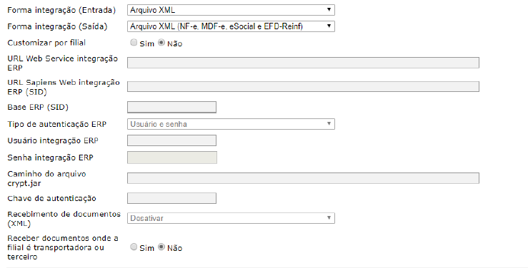 No cadastro da Filial, devem ser informados os campos Forma Integração (Entrada) como Arquivo XML e Forma Integração (Saída).