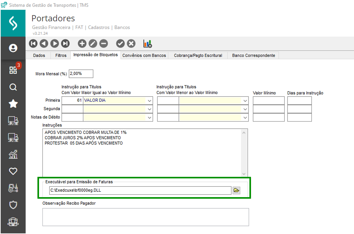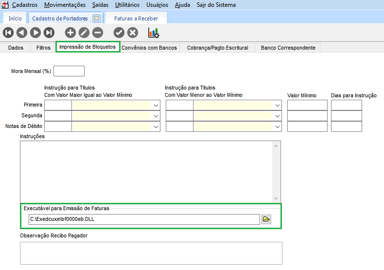 Em Cadastros > Bancos > Portadores, na guia Impressão de Boletos, preencha o campo Executável para Emissão de Faturas, com a seleção da DLL