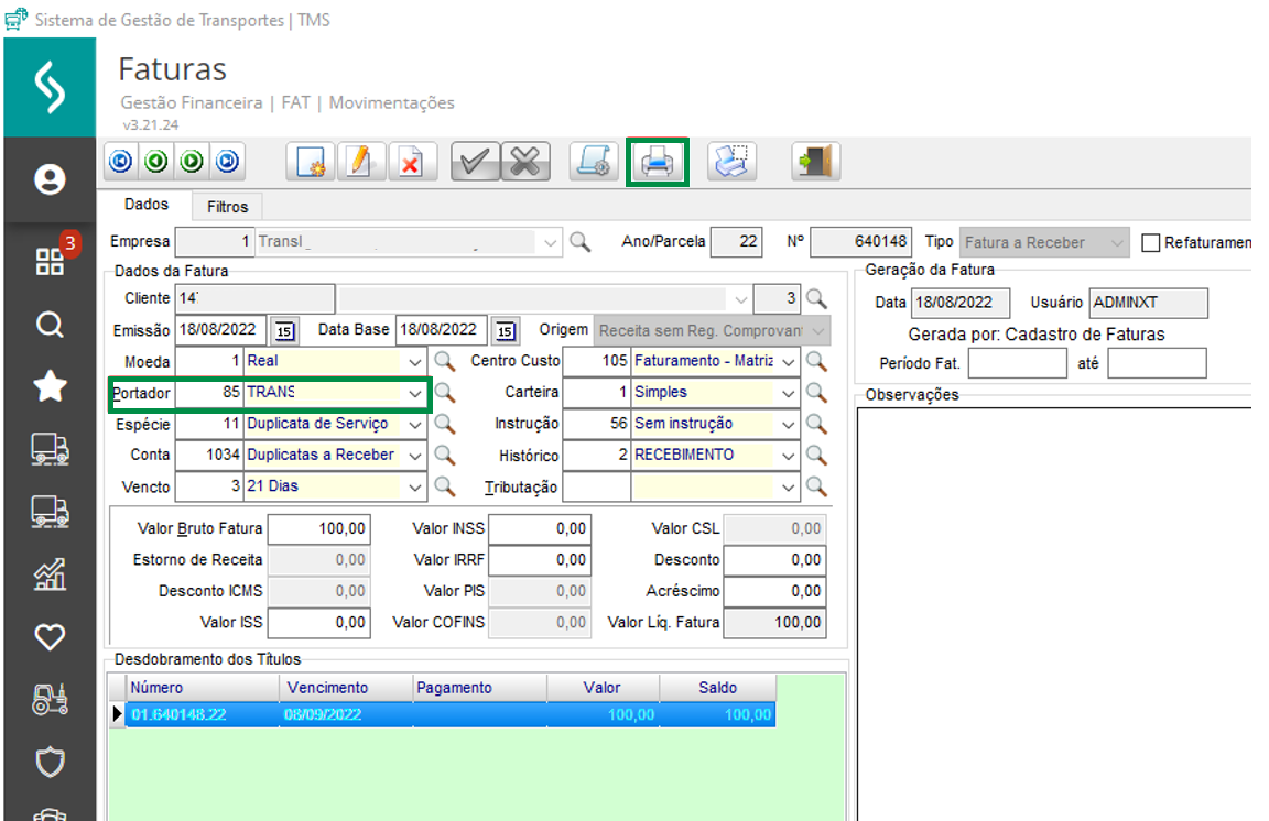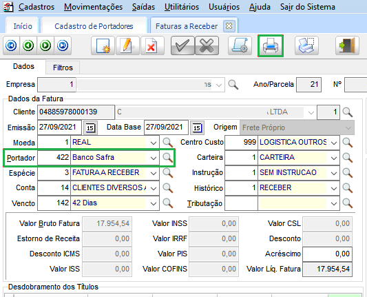 Em Faturamento > Movimentações > Faturas, é necessário selecionar o portador com a DLL configurada, vincular documentos para faturamento: