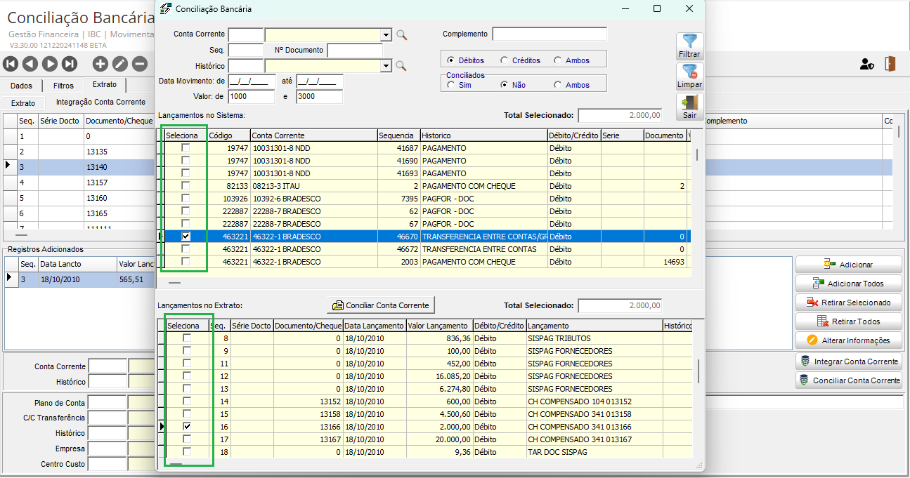 Nesta rotina também é possível conciliar movimentos de conta corrente com o extrato da conciliação bancária. Basta selecionar item do registro de extrato com movimentação de conta corrente de mesmo valor.
