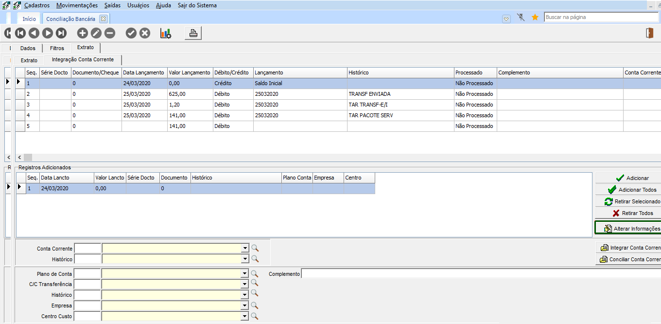 Os registros da Conciliação Bancária não podem ser alterados, ou seja, não podem ser inseridos registros, editados ou excluídos. Apenas os registros da guia Integração Conta Corrente podem ter seus registros alterados.