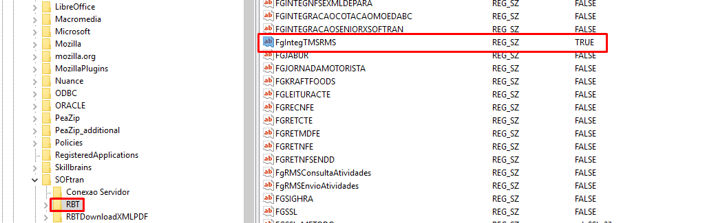Após realizar as configurações acima, com atalho das teclas Windows+R, ao abrir a tela digite regedit, selecionar o RBT na opção “FgIntegTMSRMS” e altere para TRUE.