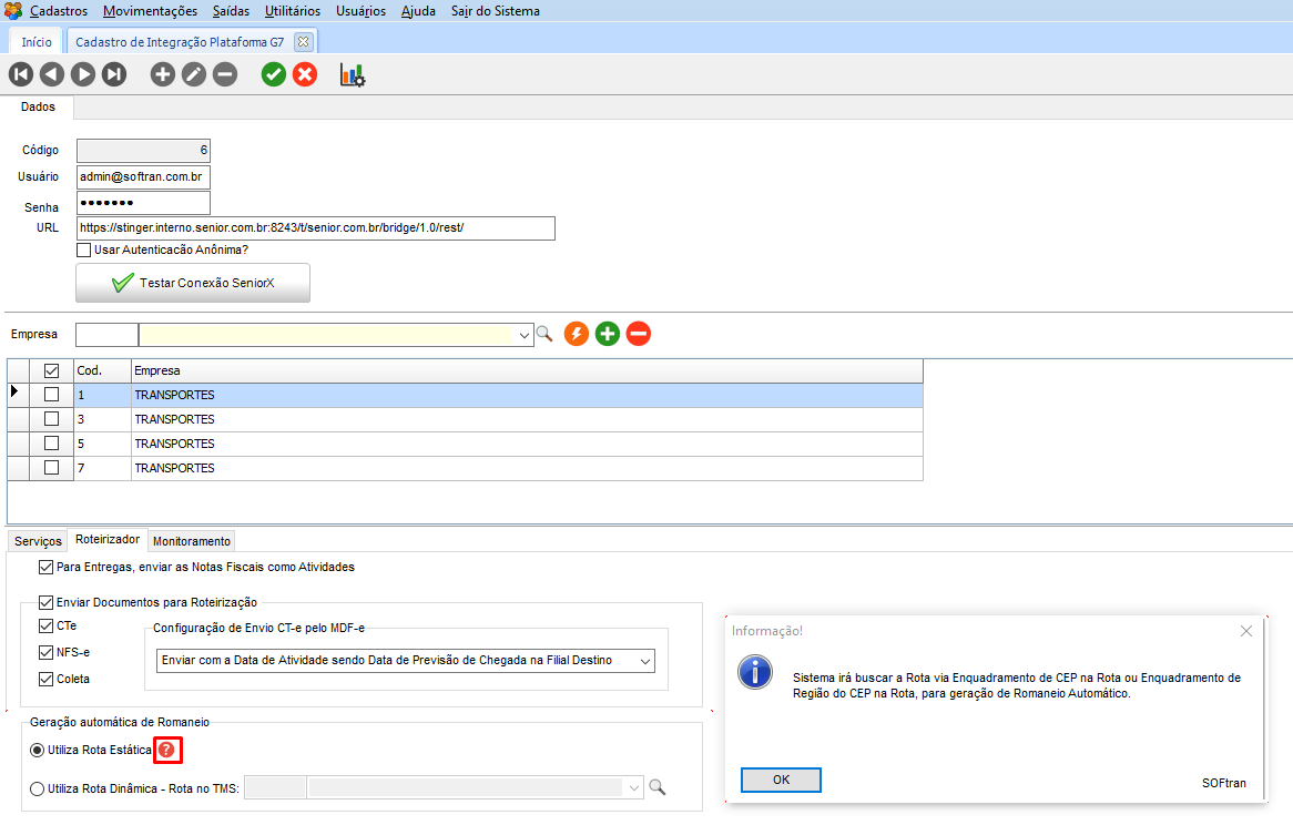 No módulo CFG, em Cadastros > Cadastro Integração Plataforma G7, com o usuário/senha/URL utilizado como exemplo selecionado, na guia Roteirizador, em Geração Automática de Romaneio, marcar a opção Utiliza Rota Estática.