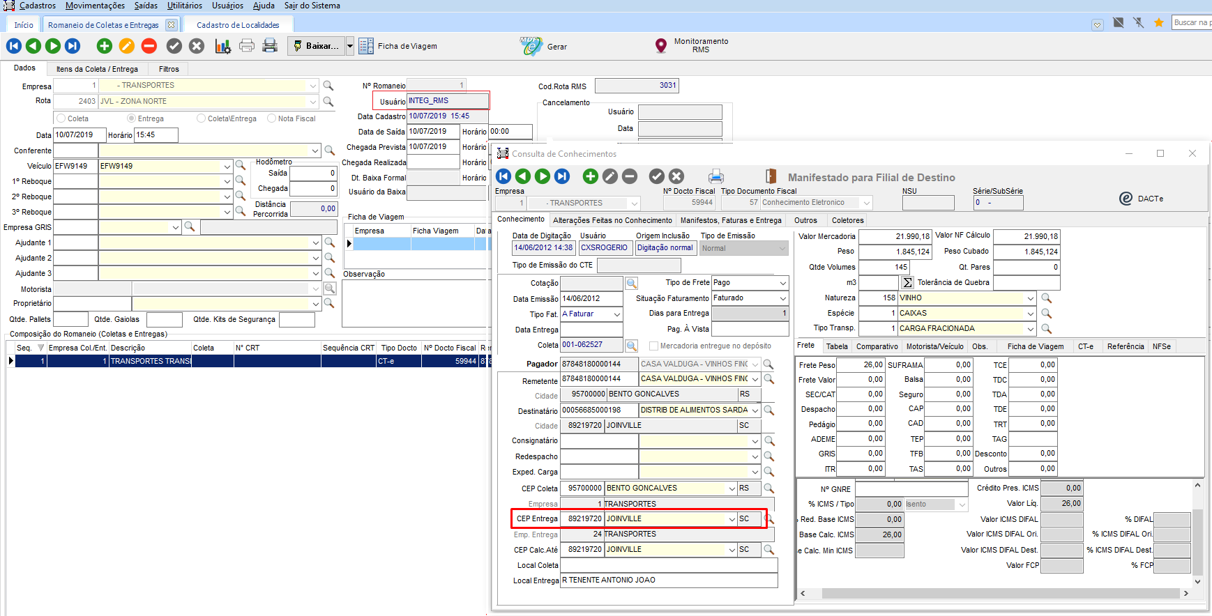 Na tela do Romaneio de Coletas e Entregas, consultar novamente o romaneio gerado automaticamente pelo RMS. O sistema apresenta o romaneio com a mesma rota (campo Rota) que foi informada nas configurações do CFG.