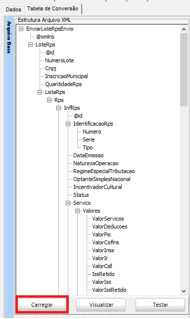Fazer o carregamento do arquivo XML clicando no botão Carregar, sendo carregado em Estrutura Arquivo XML, podendo visualizar o arquivo XML em outra tela.