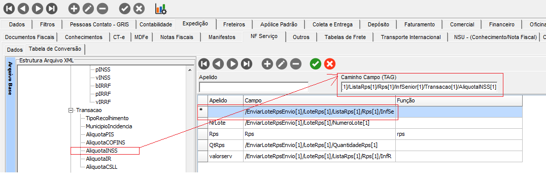 Acesse o módulo CFG em Cadastros > Empresas > aba Expedição sub aba NF Serviço sub aba Tabela de Conversão.