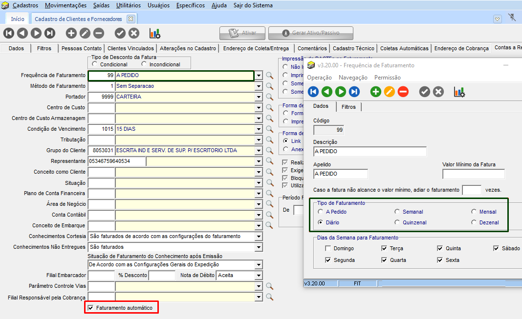 Após, no módulo EXP em Cadastros > Clientes e Fornecedores > Clientes e Fornecedores, com o cliente que usará para emitir o CTe selecionado, na guia Contas a Receber, verifique o campo Frequência de Faturamento. Este, deve ser selecionado com um tipo de faturamento igual à Diário, com a opção Faturamento Automático marcada: