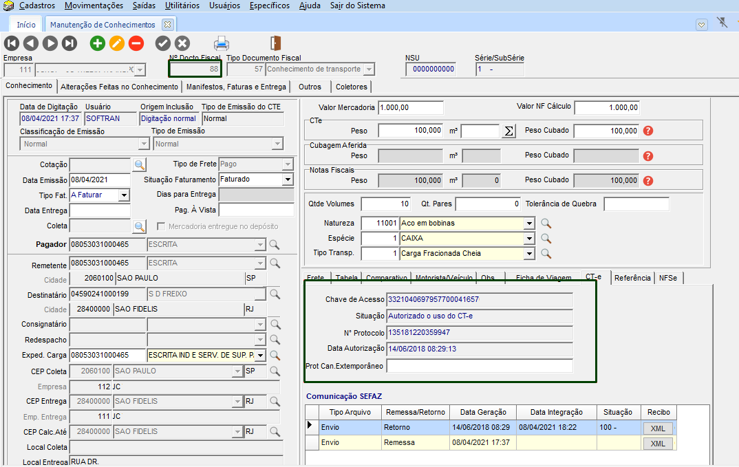 Após realizado configurações, no módulo EXP, realizado a emissão de um CTe.