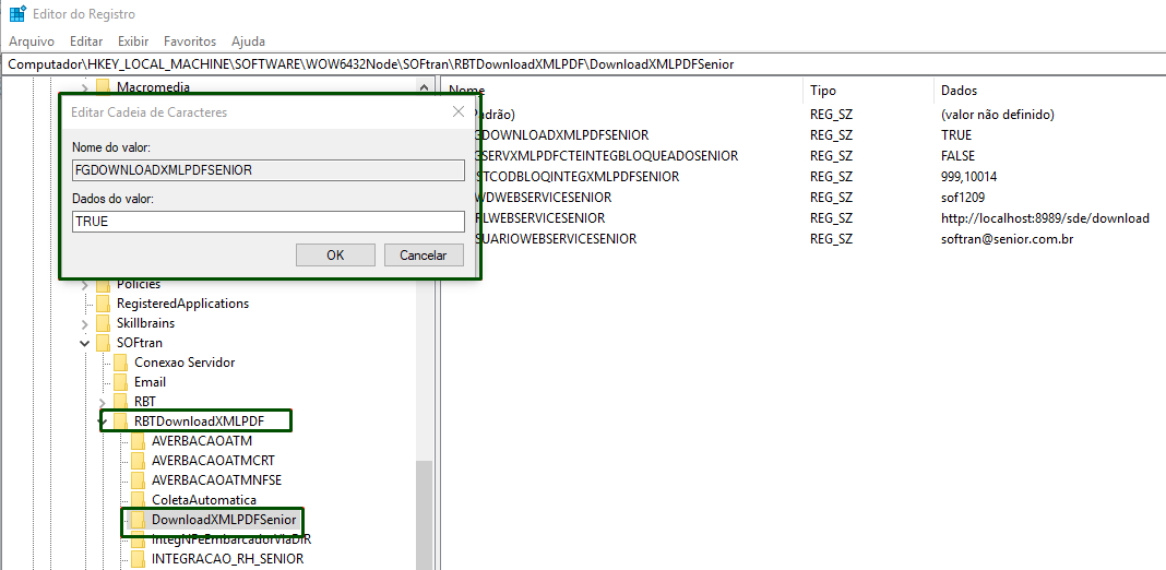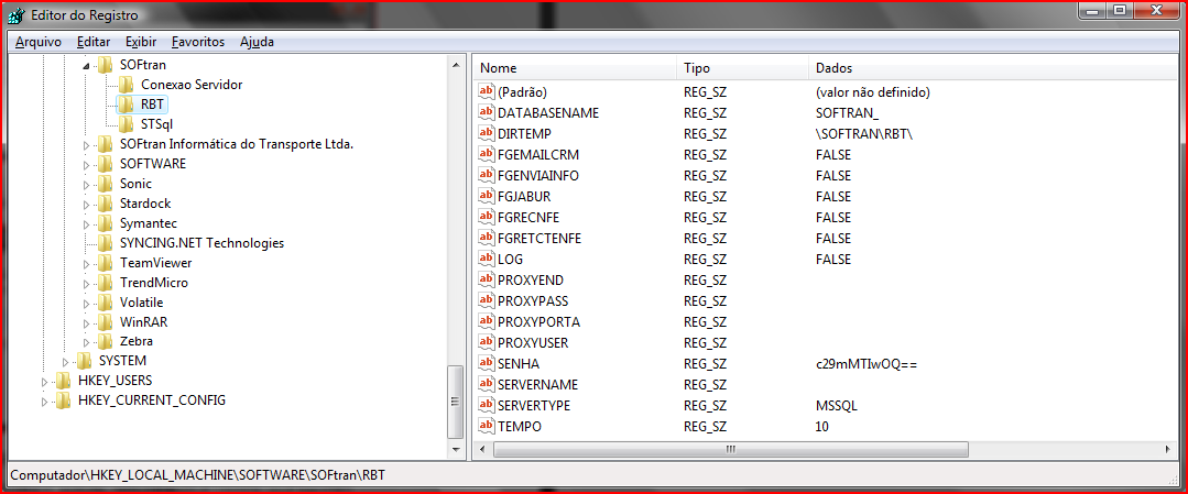 - Para sistemas 64 bits: Acesse em HKEY_LOCAL_MACHINE\SOFTWARE\Wow6432Node\SOFtran\RBT