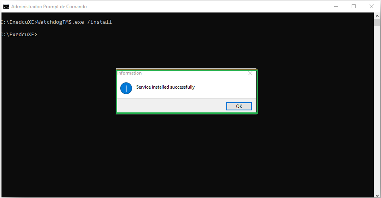 - No diretório selecionado digite o comando WatchdogTMS.exe /install para que o serviço seja instalado na lista de serviços do Windows.