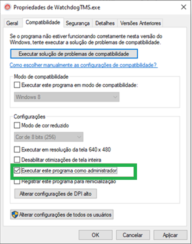 - Acesse o arquivo executável do WatchdogTMS e clique com o botão direto do mouse, em propriedades selecione a opção Executar este programa como administrador e depois de selecionar a opção clique em Aplicar.