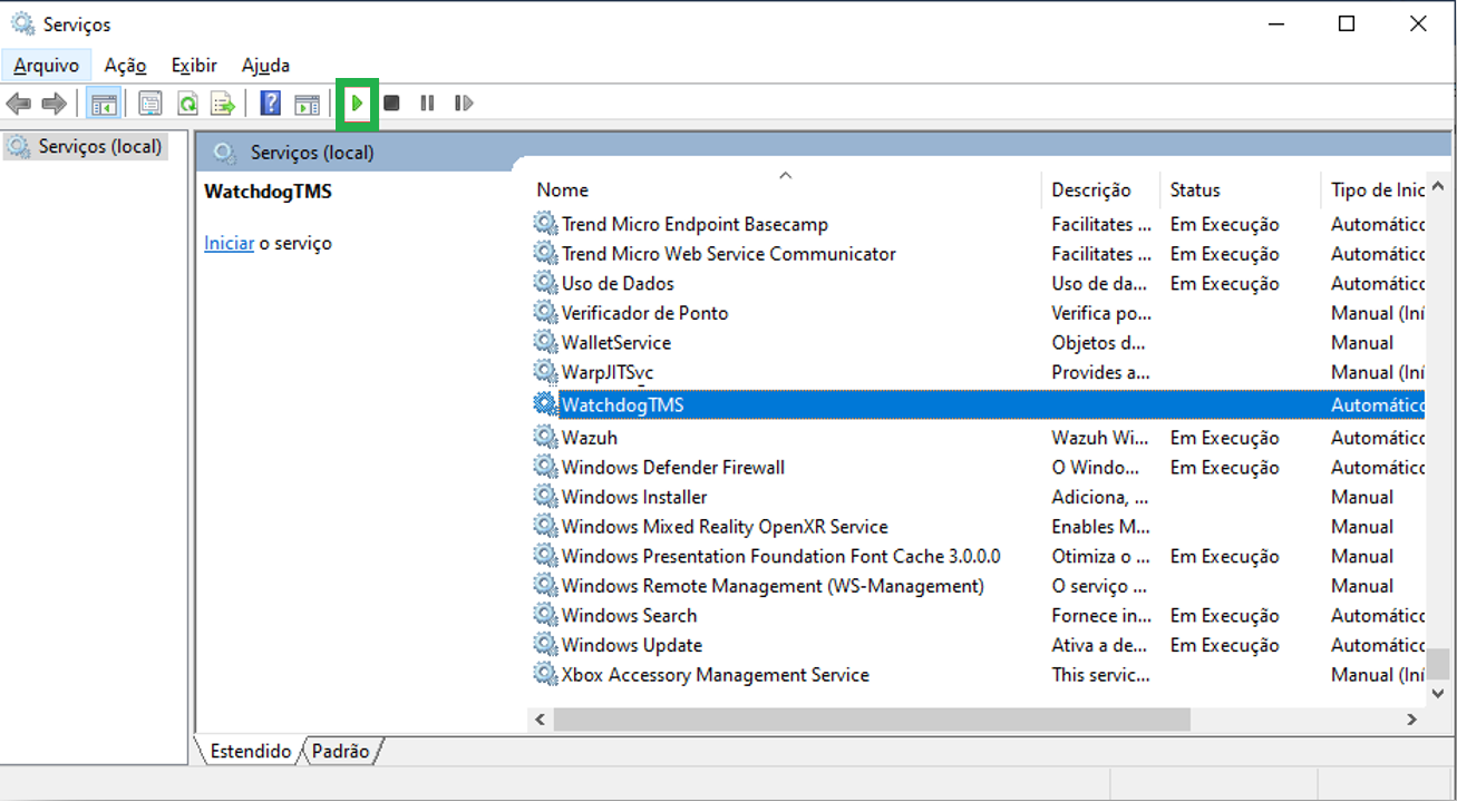 - Em seguida abra a lista de serviços do Windows e localize o serviço do WatchdogTMS, clique em Iniciar. A partir deste passo o serviço já estará em execução.