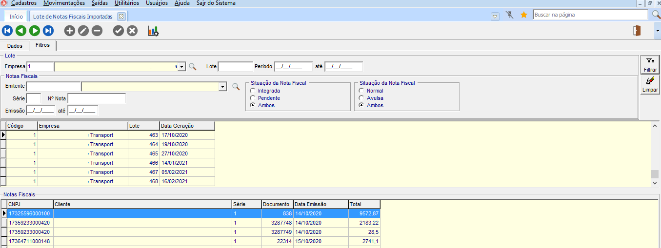 Após realizar a importação acesse, Movimentações > Lote de Notas Fiscais, na guia Filtro, realize filtro conforme a necessidade, indicamos que preencha os filtros para que otimize a utilização da rotina. Em nosso exemplo, utilizamos os filtros de empresa do lote e a situação da nota Fiscal: