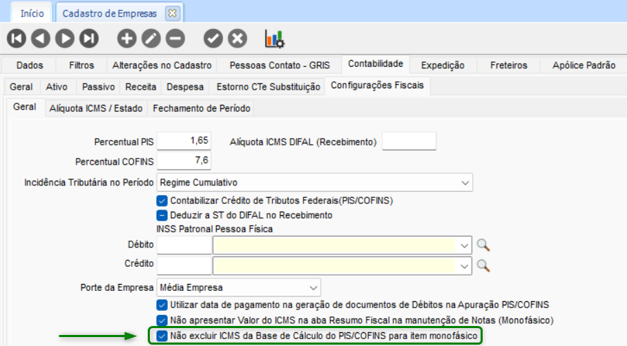 No Recálculo da Apuração PIS/COFINS em CTB > Utilitários, quando a configuração estiver marcada, não irá realizar a exclusão do ICMS da base de cálculo do PIS/COFINS para itens monofásicos da Nota de Recebimento.
