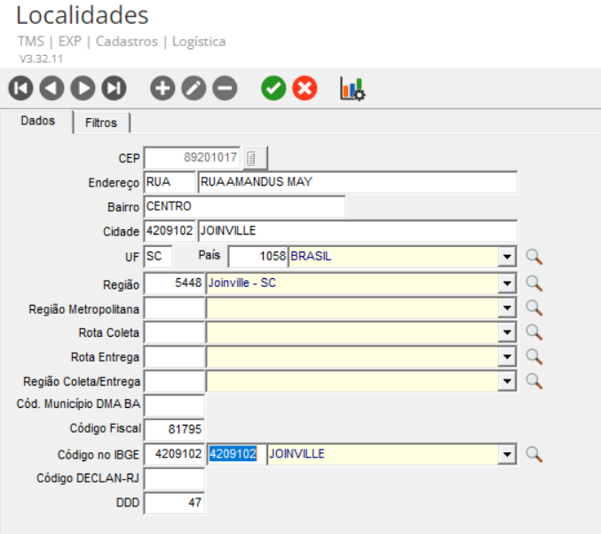 - Na rotina Localidades, localize o cadastro do endereço do Destinatário.