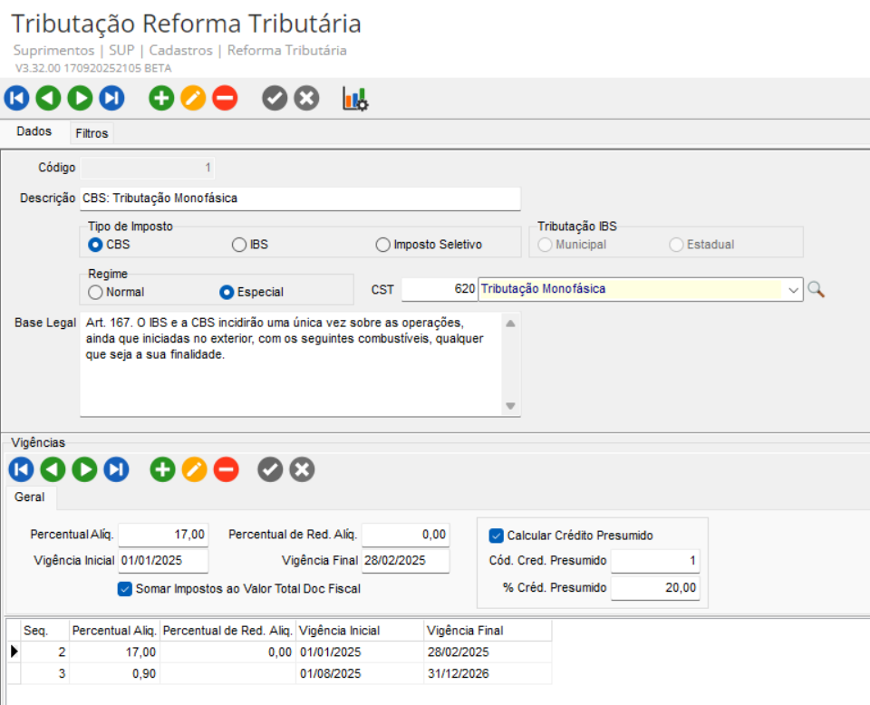 Em SUP > Cadastros > Reforma Tributária > Tributação Reforma Tributária, deverá ser cadastrada a tributação para a Reforma Tributária.