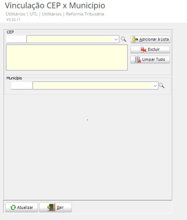Para isso, acesse, UTL > Utilitários > Reforma Tributária > Vinculação CEP x Município e siga os passos a seguir: