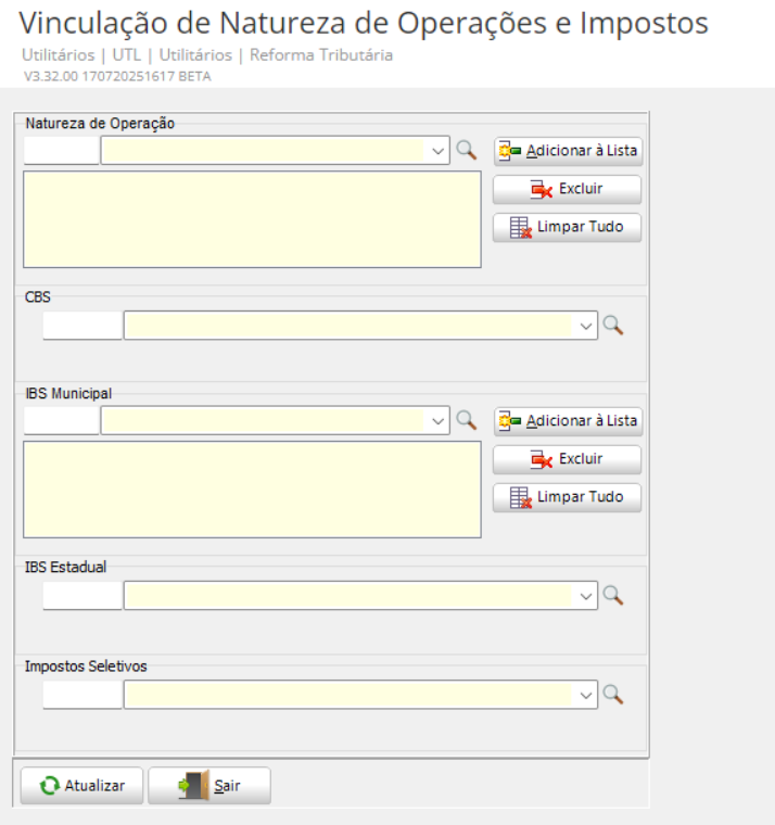 Em UTL > Utilitários > Reforma Tributária > Vinculação de Natureza de Operações e Impostos, é possível realizar a configuração em massa de várias naturezas de operação para as devidas tributações de impostos da reforma tributária.