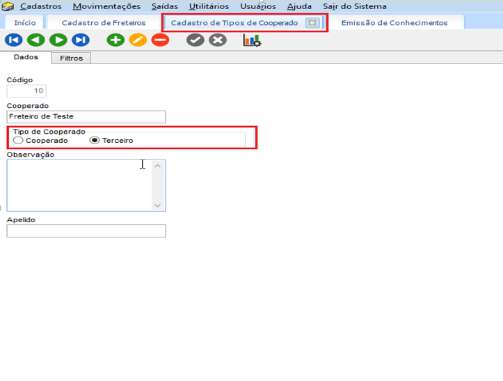 Lembrando que: O tipo de Cadastro deve estar marcado como “Cooperado”, para cadastrar é em EXP > Cadastros > Motoristas >Tipos de Cooperado