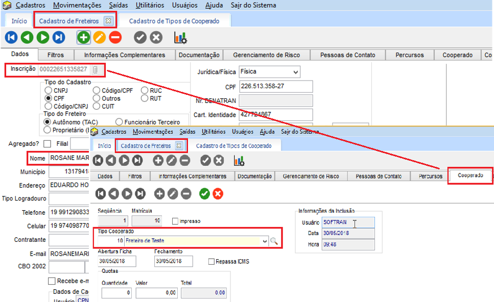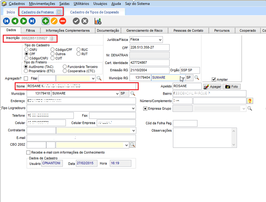 Em EXP> Cadastros > Motoristas > Freteiros, o Freteiro utilizado deve ser do tipo cooperado, na guia Cooperado , campo Tipo cooperado, deve estar preenchido conforme cadastro acima.